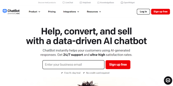 Pricing is subscription-based with a 14-day free trial, after which businesses can choose plans based on active chats and features. Its Starter plan will cost you $52/month for 12,000 chats per year. ChatBot excels at combining automation with human support — making it a reliable choice for customer-focused companies.
